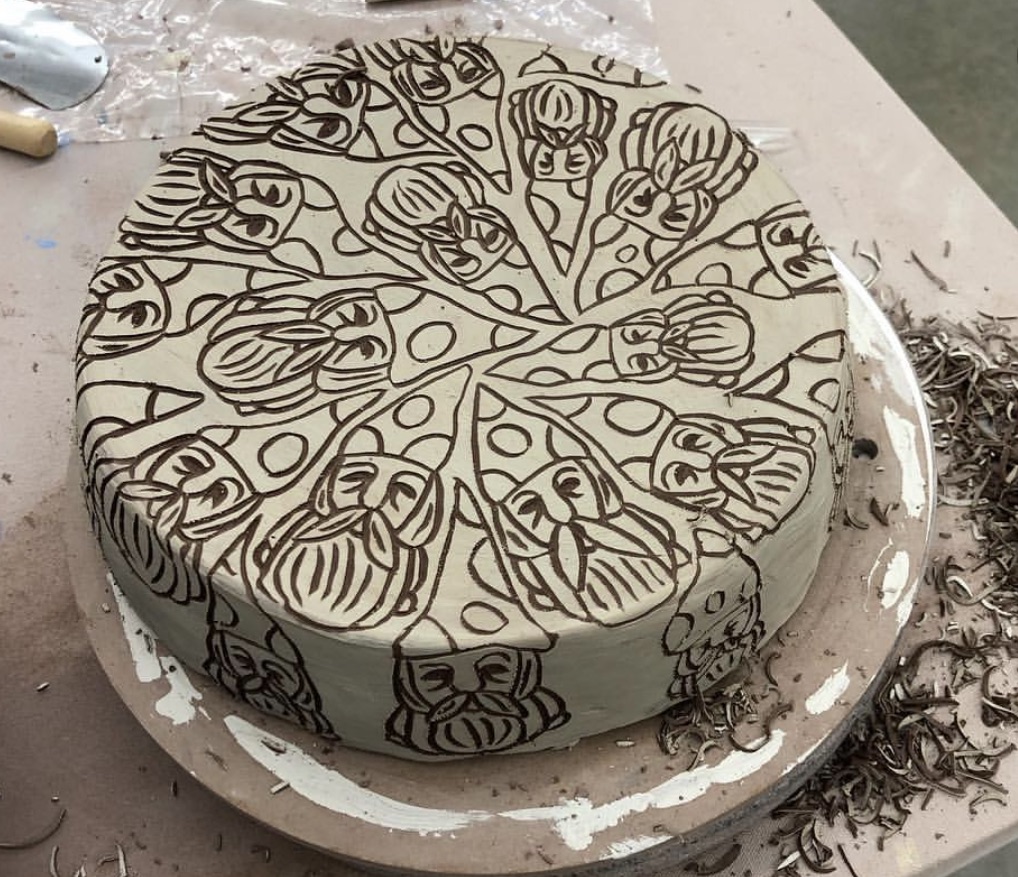 In 2016 through 2018, I used slab techniques to create cylinders (mugs), raised pieces (cake stand and fox), and more low relief pieces.