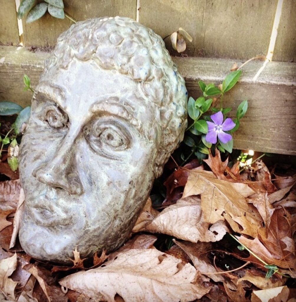 We bought our house in the summer of 2012 and the house has an adorable fenced in small side yard with large trees and some bedding. I really wanted to create an enchanted fairy garden feel. So we decided to start collecting random garden sculptures and I wanted to make some clay pieces to also add to the garden. Early on, I created this random bust of myself, along with masks from different clay bodies with various finishing techniques. These are pretty rough and quick pieces that looking back now I see a lot of problems with the features and the glazing.